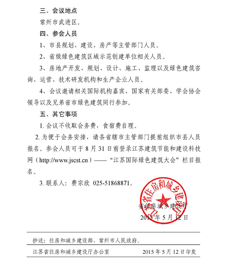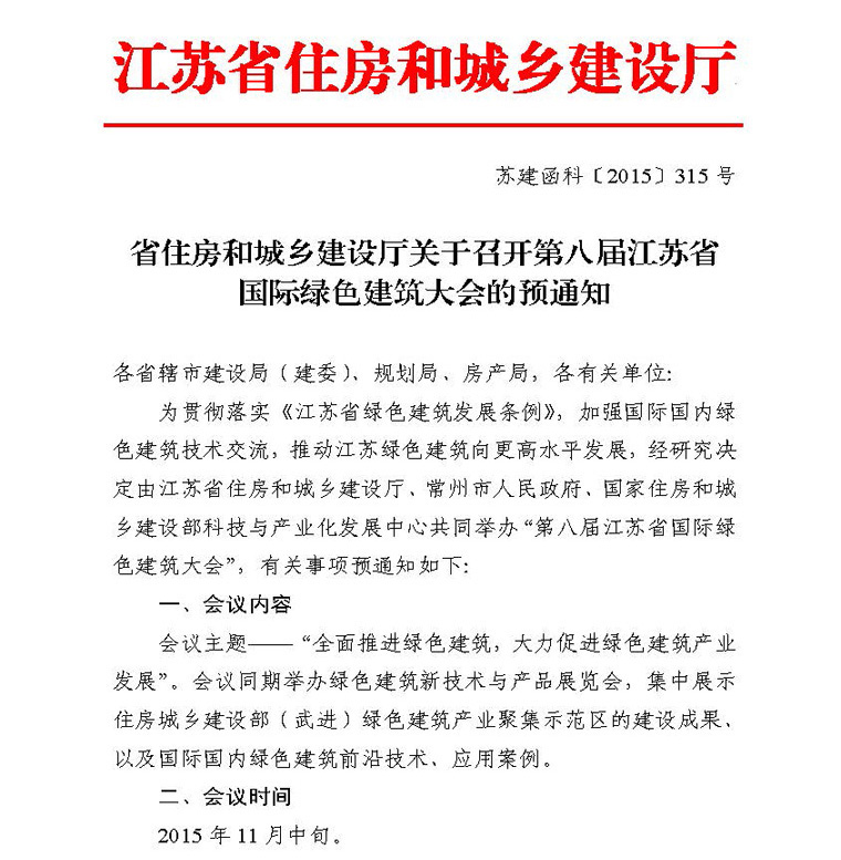 Province Housing and Urban Construction Department of the pre-notification on the convening of the Eighth International Green Building Conference in Jiangsu Province - Su Jian letter [2015] No. 315