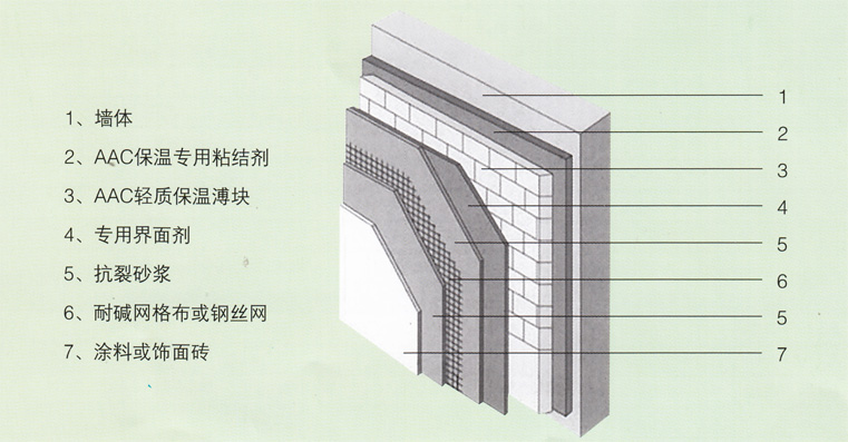 AAC building insulation system refers posted outside the country or inside patch AAC thin lightweight insulation blocks and various ancillary auxiliary materials, solve building wall, roof insulation of the entire treatment program. The system composition diagram is as follows:
